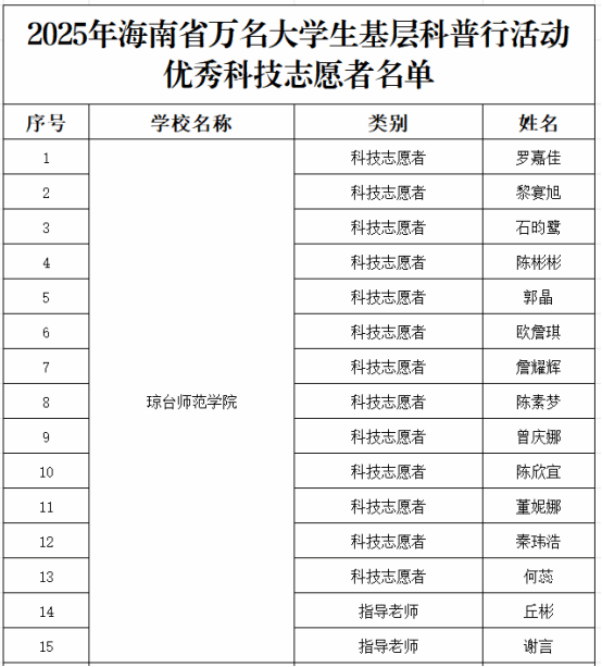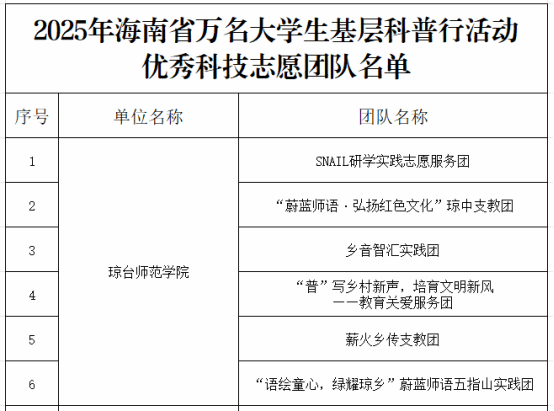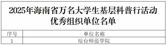 近日,由省科协、省委文明办、省教育厅、团省委联合主办的2025年海南省万名大学生基层科普行动圆满结束,表彰结果正式公布。我校获评“优秀组织单位”,6支队伍获评“优秀科技志愿者团队”,13名学生和2名老师分别荣获“优秀科技志愿者”和“优秀指导老师”。